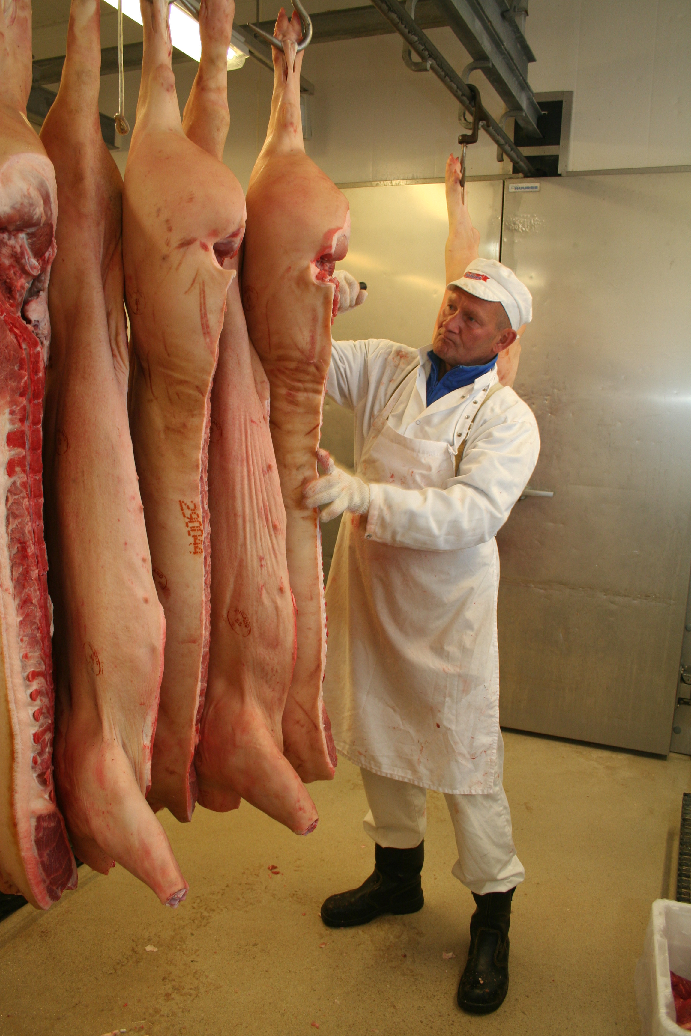 Kokonainen possunruho painaa 50-80 kiloa. Päivisin Kari Takala nostelee puolikkaita ruhoja 100-160.
