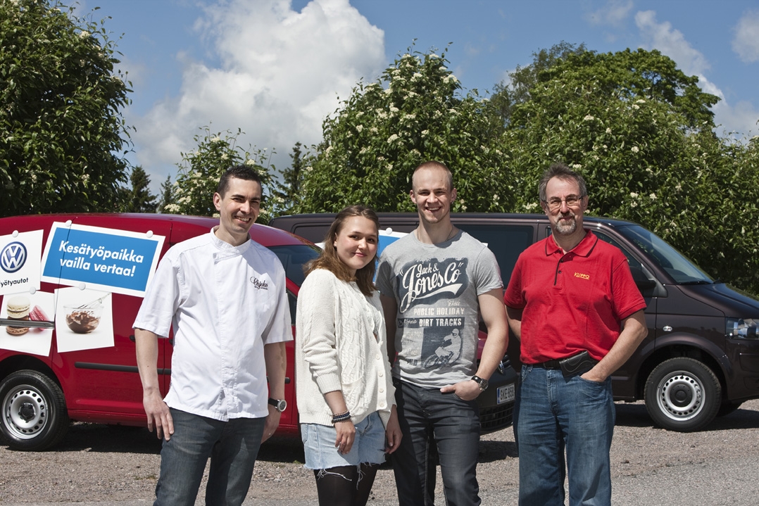 Kesätyöpaikka vailla vertaa –tiimit 2012 Mika Gröndahl Chjokosta, ”Annukka” Veera Pennanen, ”Antero” Jere Nokkonen ja Leo Mikola Konekeskus Mikolasta taustalla Volkswagen Caddy ja Transporter