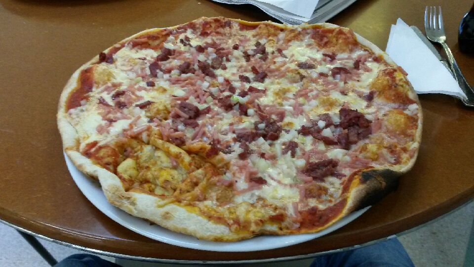 Pizzoillakaan ei ollut mitään erityisiä nimiä, sellaisia kuin ”Frutti di Mare” tai ”Alla pollo”. Se oli vain pizza, jossa li täytteenä kinkkua, sipulia, metvurstia ja juustoa. Mutta ei se päätoimittaja turhaan kehunut. Pohja oli sopivan rapea, ei kuitenkaan kuiva. Mutta ei myöskään sellainen lässähtänyt taikina kuin aika usein noissa lähiöpizzerioissa tapaa olla. Voisi sanoa, että 6,60 euron hintaan sitä voi vain suositella.