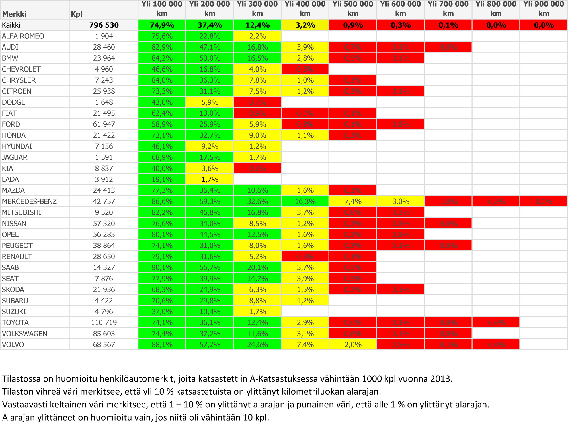 A-Katsastuksen tilasto käsittää noin 800 000 viime vuonna katsastetun auton kilometrilukemat. Tilastossa ovat mukana ne autot, jonka merkkisiä katsastettiin vähintään 1000 kpl. Merkit on jaettu eri kilometriluokkiin siten, että tilastosta ilmenee kuinka monta prosenttia kyseisen merkkisistä autoista on ylittänyt kilometriluokan alarajan.