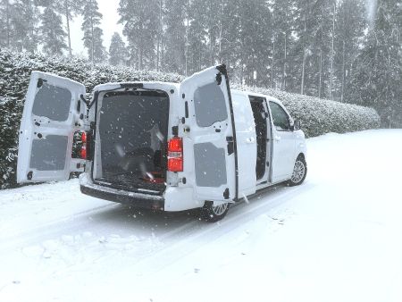 Vajaan tonnin kantavuus tekee e-Expertistä kelpo tavarankuljettimen. Pituutta on hyvin, mutta seisomakorkeutta tavaratilassa ei ole. Muuttopuuhiin ei oikein kannata lähteä muuten kuin apuautoksi, tai sitten reissuja on ajettava useampi normaalin muuton yhteydessä. Crossipyörä kyllä mahtuu kyytiin, tai kuution IBC -kontti sekä työkalut ja alle kaksi metriä korkea auto mahtuu vielä parkkihalliin. Nykyään tavaratilat verhoillaan hyvin jo uutena ja kiinnityskoukut ynnä valaistus ovat valmiina hyötykuormia varten. Kuljettajan viereen mahtuu tässäkin Pösössä kaksi matkustajaa, mutta silloin heidän on syytä olla melko kapeaa mallia.