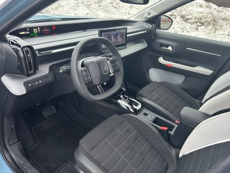 Koeajoon sain Max-varustellun e-C3:n, jonka hinta nousee jo karvan alle 30 000 euron. 4000 euron lisäinvestointi tuo autoon led-ajovalot, automaattisen ilmastoinnin, peruutuskameran tutkan sijasta, kevytmetallivanteet, mukavuusistuimet ja kosketusnäytöltä ohjattava tietoviihdejärjestelmän.