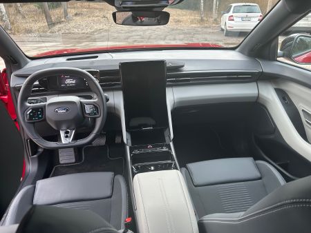 Kosketusnäyttö on valtava, 14,6 tuumaa, ja se on asennettu pystyyn. Fordissa näytön kulmaa voi kuitenkin vaihdella, eri asentoja löytyy kolme.