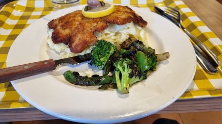Itse valitsin lounasannokseksi noutopöydän sijasta broilerinleikkeen bataattiranskalaisilla ja pekonilla. Hinta oli 15, 50 €. Vaikka hintaa ei voi pitää varsinaisesti halpana, niin rahan väärti tuo valinta kuitenkin oli. Lautasen reunalle oli isketty suosikkikasvistani parsakaalia. Parasta oli rapeaksi paistettu pekoni. Mikään ei ole iljettävämpää kuin punakan veltoksi jätetty löysä pekoni. Myös bataattiranskalaiset oli kypsytetty juuri sopiviksi.