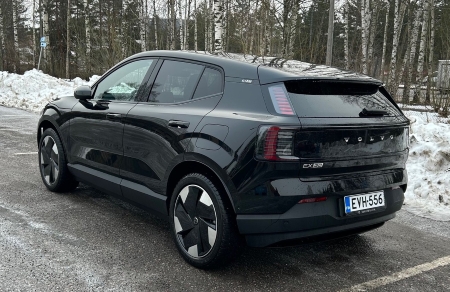 Jos ovat hallintalaitteiden ratkaisut EX30:ssä vähän liiankin erikoisia, niin itse autona se on erinomainen. EX30 Ultra Twin -versiossa kaksi sähkömoottoria, joista irtoaa yhteensä huimat 428 hevosvoimaa ja 543 Nm vääntöä. Näillä eväillä EX30 kiihtyy nollasta sataseen vain 3,6 sekunnissa: kovin moni tämän kokoluokan sähköauto ei kykene samaan.