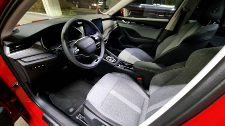 Kojelaudassa on käytössä Škodan uusin muotoilukieli. Keskipaikan hallitsee nyt 13-tuumainen kosketusnäyttö, jonka toimivuus ja nopeus ovat selkeä parannus edeltäjiin. Fyysisiä painikkeita on jätetty mukaan juuri sopiva määrä. Materiaaleiltaan sisusta on harkittu kokonaisuus, jossa kangas, pehmeät pinnat ja nahka muodostavat rauhallisen ja laadukkaan kokonaisuuden.